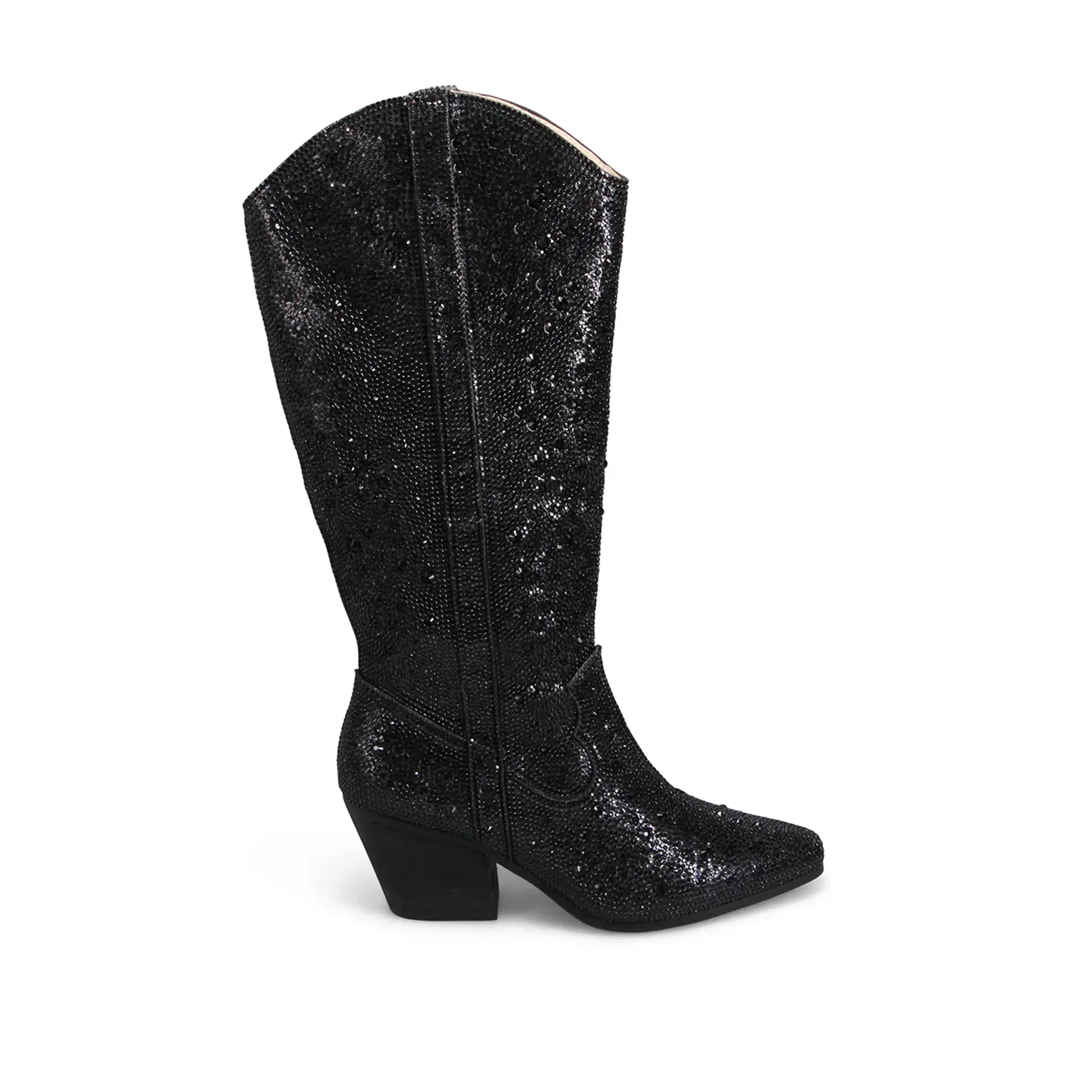"Bedazzled knee-high boots with cowboy flair, Westyn by Django & Juliette turns up the volume on a classic silhouette with a show-stopping diamante-encrusted finish."