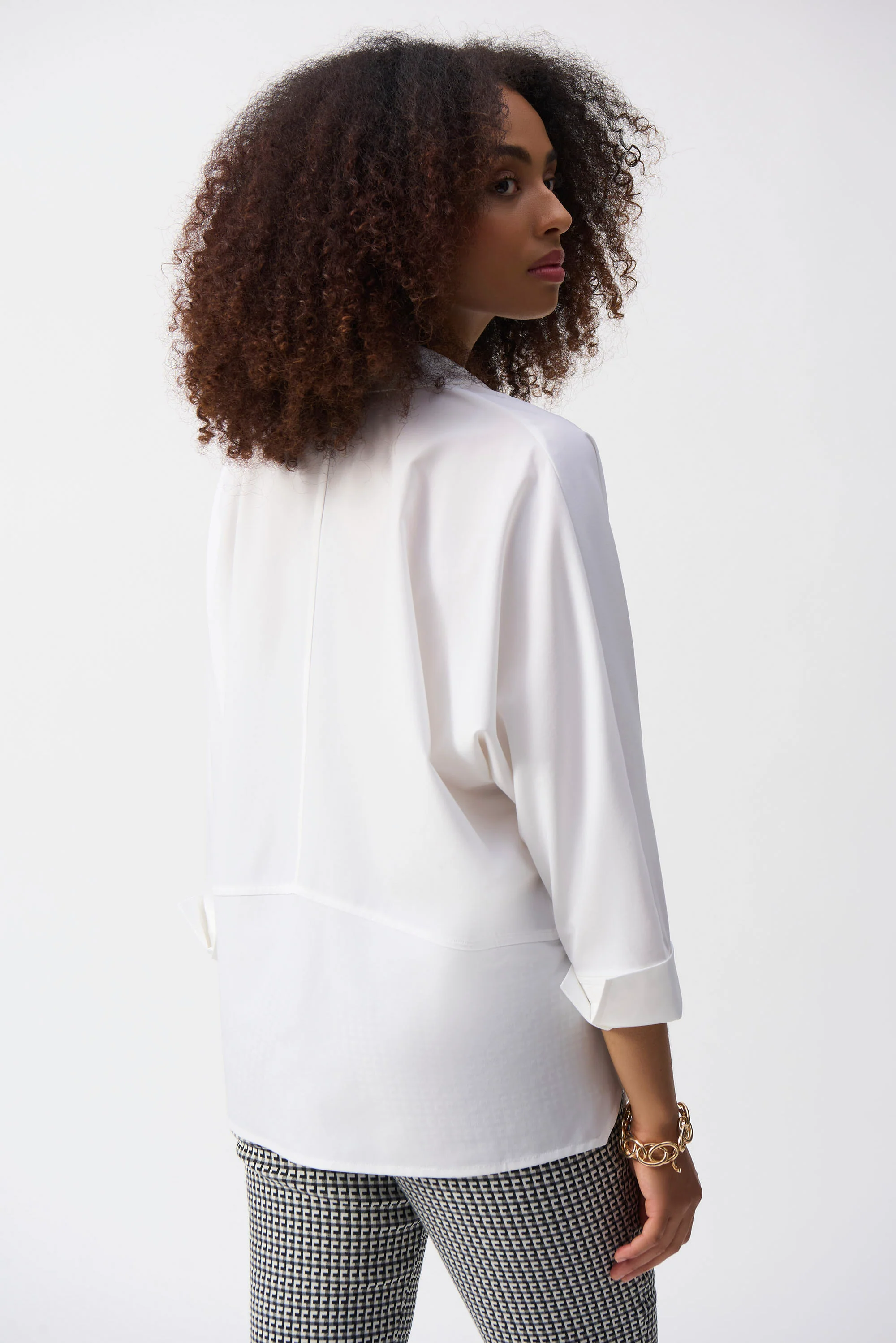 Experience the perfect blend of chic and minimalistic style with Joseph Ribkoff's pullover. Designed with a regular fit and hip-length cut, this top features a collar neckline and 3/4 straight sleeves, making it ideal for both casual and office occasions. The plain pattern and buttoned details add a touch of sophistication to your wardrobe, ensuring you look effortlessly stylish.