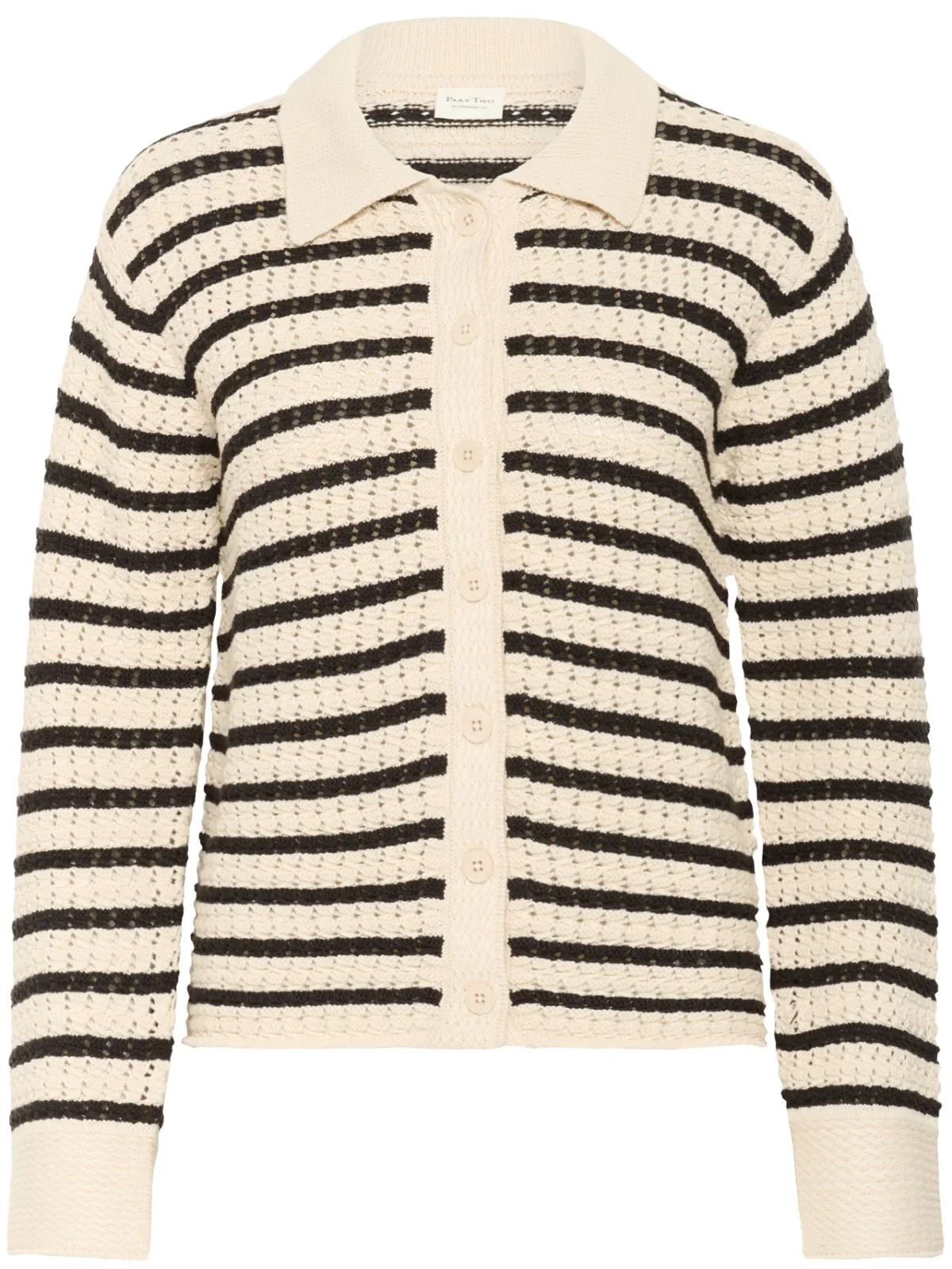 This Part Two Tracy Openwork Cardigan features a shirt collar and full-length buttoning for easy wear. The buttoned sleeves add a polished touch, making it a versatile layering piece for any outfit.